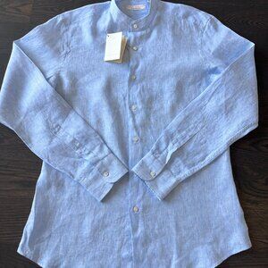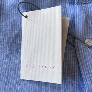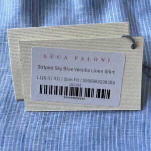 Luca Faloni Versilia linen shirt in striped sky blue. Size is L (16.0 / 41), slim fit. Made of 100% Italian linen.