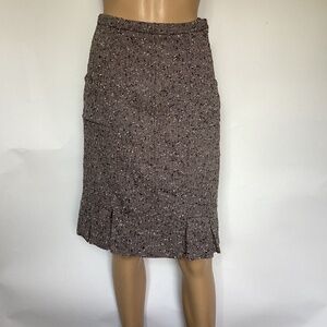 NWT never worn ‘Italian tweed ‘Mona’ knee length skirt. Side zipper, front pockets, pleats around the bottom. 100% silk lining. Very good condition. Slight scent of perfume. Color is plum on label. Grayish tone with purple, black, white, yellow threads throughout. Size 40 on tag. Waist laying flat 12, making this a US size 2. Length from waist 23”.