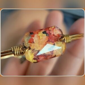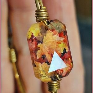 Fall Leaves Bangle Bracelet, featuring a faceted rectangular stone in warm hues of red, orange and gold.