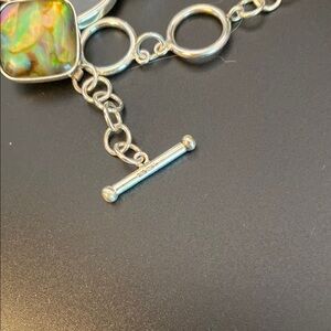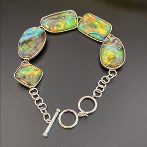 Gorgeous sterling silver bracelet featuring vibrant abalone shell stones by Lucas Lameth. Perfect for adding a touch of color to any outfit. Adjustable. Stamped 925. 7 inches. Toggle bracelet.