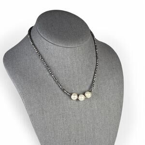 Features three pearls (approx 10mm) strung with silver/gray faceted beads