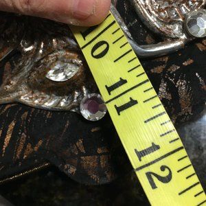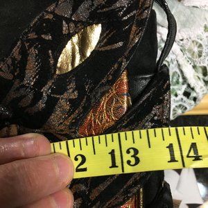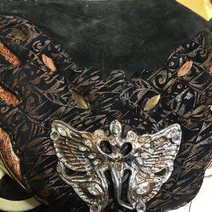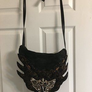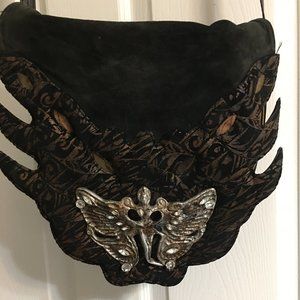 This purse is gorgeous, Real leather, metal angel dark colors and so beautiful and rare. This is only about 2 inches in depth, meaning you cannot stuff this purse, It's great for cell, wallet, and keys. Truly beautiful and rare