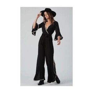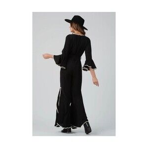 A retro fun statement! A jumpsuit with contrast binding detail with wide leg and bell sleeves.