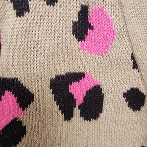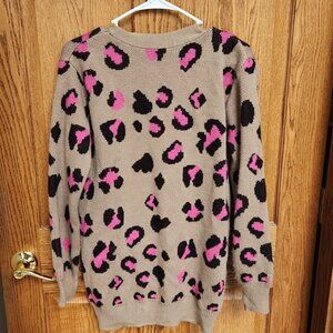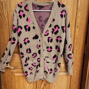 Stylish leopard print cardigan. Features tan base with pink and black spots. Button-up front. Two front pockets. Great condition!