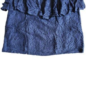 Brand: Lucca Couture. Occasion: Casual, Party, Date Night, Vacation, Festival. Size Type: Regular. Size (Women's): M. Material: 60% Rayon, 40% Polyester (Self), 100% Rayon (Lining). Style: Mini Skirt, Ruffle, Peplum, Lace, Tiered, Boho, Chic, Feminine, Romantic. Color: Navy Blue. Pattern: Lace. Features: All-over lace fabric, ruffled peplum overlay, mini length, lined interior, back zipper.
