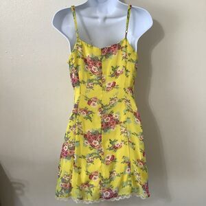 Bohemian Boho Spring Summer Aesthetic Whimsical Floral Yellow Multicolor Lace Trim Strappy Sheer Overlay Slinky Slip Lined Mini Length Dress with Adjustable Straps
