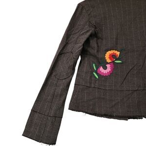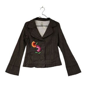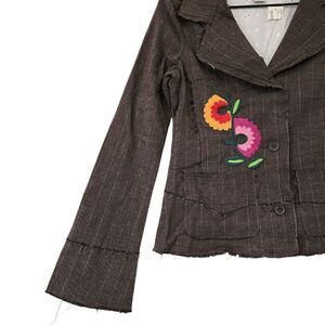 Lucca Distressed Embroidered Herringbone Pinstripe Jacket. Has factory Frayed Seams and metallic pinstripes across a herringbone print. The lining is Eyelet Lace. Button front closure with 2 pockets.