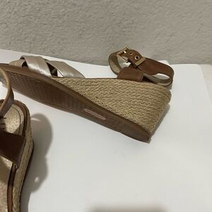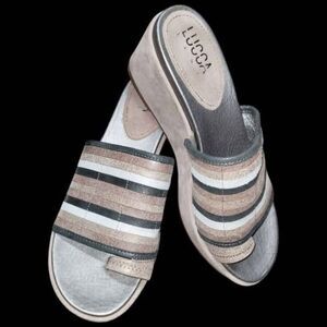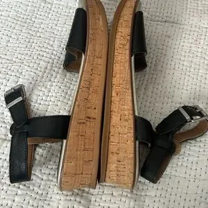 Luca Lane black leather wedge sandals with adjustable ankle straps and cork soles. Comfortable, versatile, and easy to style. Very good pre-owned condition with light wear and plenty of life left.