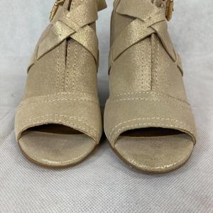 You are viewing a pair of: Lucca Lane Sandals Womens Sz 10 Gold Leather Heel Stack Heel Open Toe