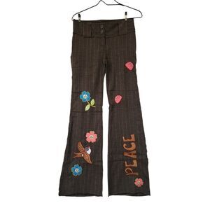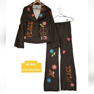 Lucca Distressed Embroidered Herringbone Pinstripe Pant. Fun Embroidery of Mushrooms Sailor Swallows, flowers, and more. Has factory Frayed Seams and metallic pinstripes across a herringbone print. Button front and zipper closure with 2 pockets.