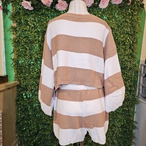 Lucca set, stylish sweater set with bold tan and white stripes. Includes a cozy top and matching shorts.