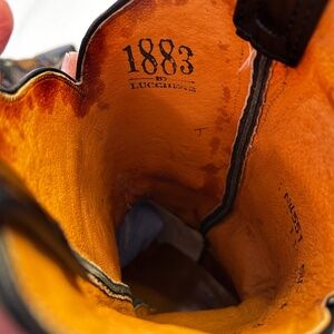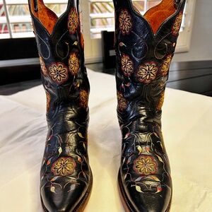 These beautifully embroidered floral boots, made in the USA, are used but have been well maintained, with some scuffs on the soles and toe, please see photos for details. The leather itself seems to be in excellent shape.