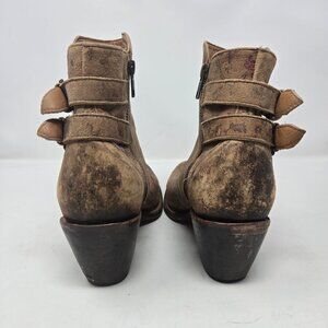 Lucchese M4953 Catalina Bootie 9B brown floral burnished calfskin leather FLAWED side zip buckle details country western rodeo farm ranch preowned condition worn soles, scuffed, scratched, faded see pics for details and wear color may appear differently depending on light. these are preowned so may need some cleaning.