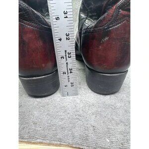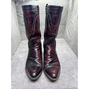 Black Cherry Brushed Italian Domingo Goat featuring looped pull straps, #2 toe, #3 heel, and 12" leg (Style 7106). Scuffing/light distressing at toe tips, heel blocks have signs of wear and are a great candidate to get replaced at the cobbler Leather is in great shape may have some light scuffs/scratches from normal wear. (Goat skin is famous for its patina quality over time). This model can no longer be purchased from Lucchese and retailed at over $1000 brand new.
