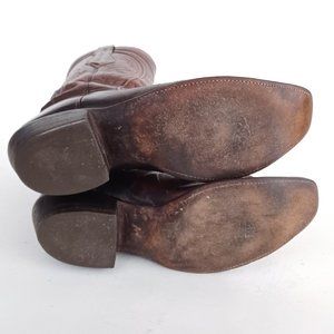 Classic Lucchese cowboy boots. Rich brown leather. Intricate stitching detail.