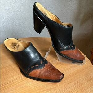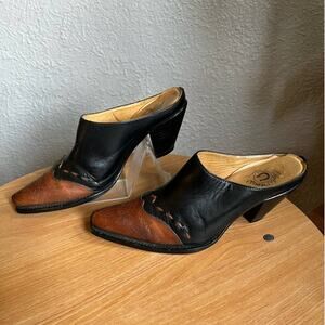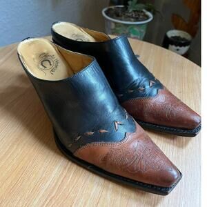 Gorgeous Brown Black Heel Western Mule by Lucchese Charlie 1 Horse! These boots are in great pre-owned condition with moderate wear.