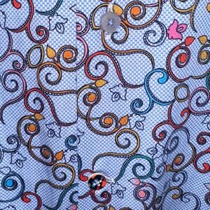 Tags: contemporary, modern, colorful, multicolor, scroll, pattern, print, gingham, check, dress shirt, party, fun, loud, statement, clubwear, dinner, dancing, favorite