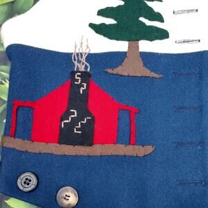 Design includes a log cabin with smoke coming out of the fireplace chimney, an evergreen tree, and a horse (?) with a beaded collar