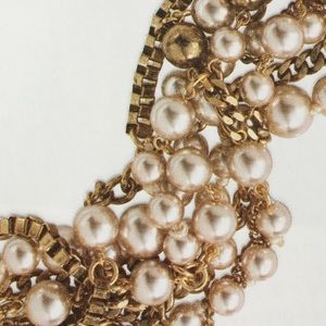Strands of hand knotted acrylic pearls and gold tone beads entwined with brass chain with gold plating. Clasp closure. Never worn with original box.