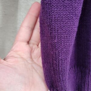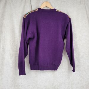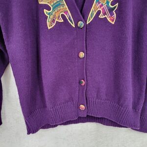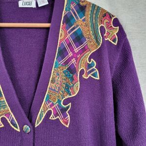 Acrylic Royal purple deep V-Neck sweater cardigan with pink purple gold tartan plaid paisley combo applique framing the neck and shoulders. Stunning Statement piece for fall and winter. Vibrant and colorful. Buttons match the applique. Removable shoulder pads.