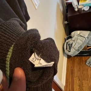 Brown V neck sweater by Luciano Barbera with orange and green accents on neck and green accent on cuffs and waist. 100% cashmere. Size 52 or US Mens L.