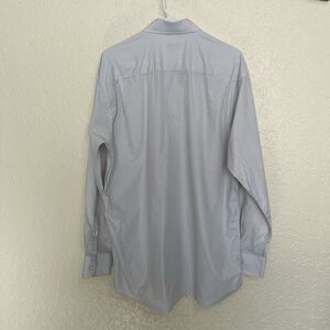 This is a Luciano Ceccarelli dress shirt for men in size 16.5. It features a white windowpane checker pattern with a collared neckline and button closure. Made of breathable cotton in Italy, the shirt has long sleeves and is designed for all seasons with easy care.