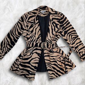 Luciano Dantè Zebra Print Belted Coat Double Breasted Fit & Flare Pleated Jacket;
