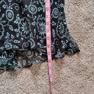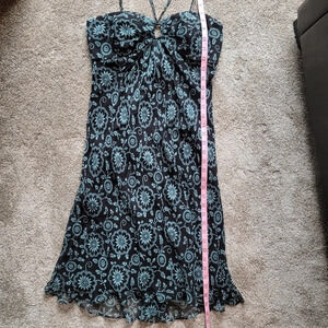 100% silk gorgeous flowy dress by Luciano Dante. Black with aqua Teal blue floral and geometric design. String halter top. Back zip. Fully lined.