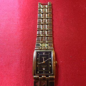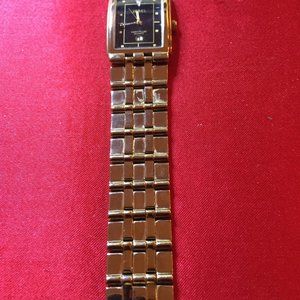 Signed Lucien Piccard. Men's Gold Tone Metal Link Band. There is signs of wear on the patina on the inside of the band. Black Dial, w/ Diamond at 12.