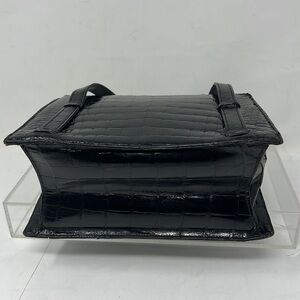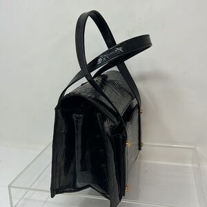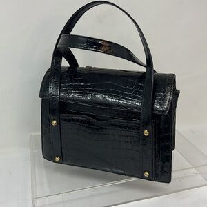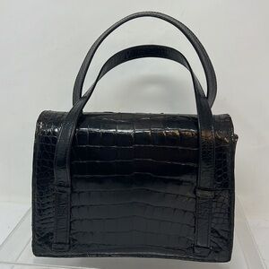This is a beautiful Lucille de Paris Black Crocodile Handbag. Vintage black crocodile does show some very slight wear at the top golf, but hardly noticeable. No odors. Front slip in pocket. Snap opens to a large interior compartment with 3 slip in pockets and one zipper pocket. Gold stud grommets on front. 8.5” x 6” x 3.75” with 6” double handles
