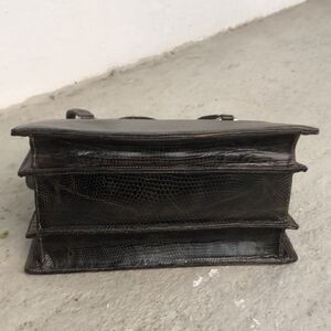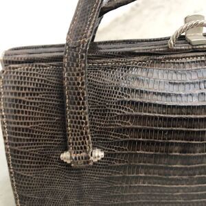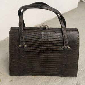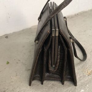 Beautiful crocodile vintage bag but as you see from the pictures only ok condition. Measuring across the bottom is 9.5 x 7 x 4.75, handle drop is 4”. Handle has a little crack on the inside.