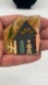 Vintage plastic lacquer coated abstract art pin / brooch by Lucinda. Shows a woman with her shadow and a house with child figure outside a house with a dove carrying an olive branch. Has artist sticker on back. Late 1980s.