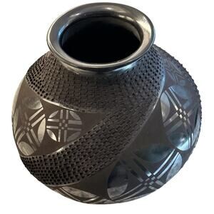 This is a beautiful black on black incised collectible piece of pottery made in the Mata Ortiz region and signed by well-known artist Lucio Soto, stands at 10" H x 9.75" in diameter with a top rim diameter of 4.75". This stunning vessel is in very good to excellent condition and will make a gorgeous addition to your personal collection or a statement/conversation stand-alone piece as part of your home decor! # 3931