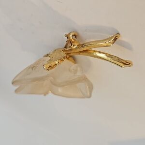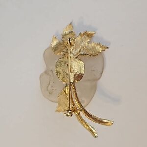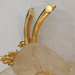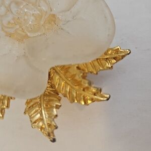 Lucite Flower with Goldtone Leaves & Stems Brooch and/or Pendant. This brooch/Pendant was an estate find, so I have no idea of age. There is some wear on the tips of a few leaves.