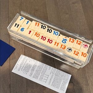 Lucite Rummikub set with lucite racks. New without box. Perfect for game nights.