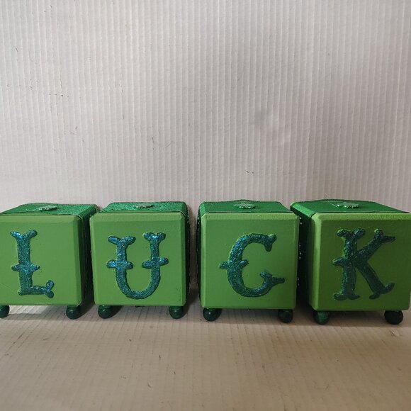 This 4-piece decor has been hand painted and hand decorated. Great for a half wall because both sides spell Luck, in order. They all have 7 clovers, 3 on each side and 1 on top. They all have 4 round feet.