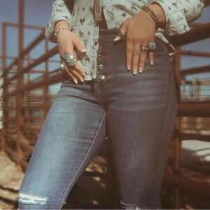 Life is more than just fitting into your jeans, but we believe you will LOVE the feel and look of L & B’s Ropin’ Distressed flares with their high waist, raw hem, oversized bell bottoms, 5 pocket cut, and an exposed button closure! These retro western bottoms will take you from season to season when you wear with your favorite open toed heel and tank top in the summer and with booties and a sweater in the fall!