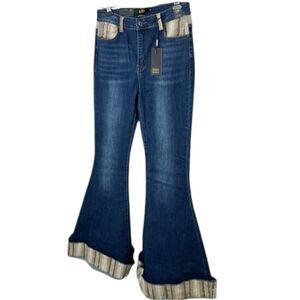 Lucky & Blessed Women's Brown Aztec Print Cuffed Dark Wash Denim Flare Jeans NWT