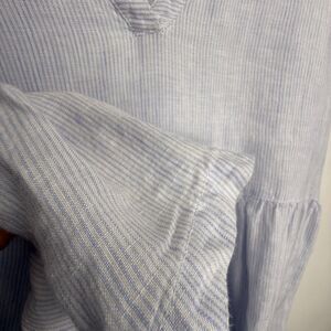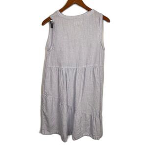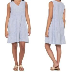 Soft & breezy 100% Linen. Dress has subtle blue-and-white pinstripes, a flattering V-neckline, and a relaxed tiered silhouette that hits above the knee. Lightweight woven fabric that’s perfect for layering or wearing solo on sunny days