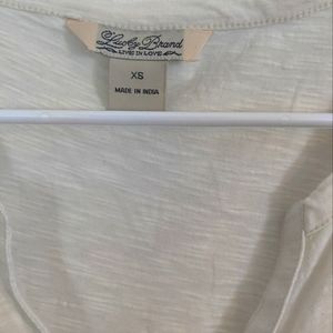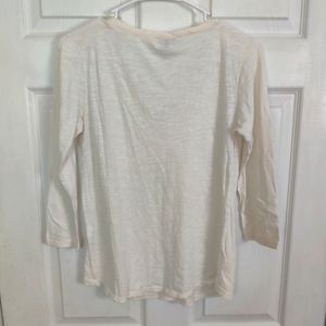 This Lucky Brand tee has a split V neck with chest pockets and 3/4 sleeves. The color is ecru or cream- it is not white.
