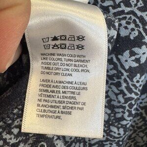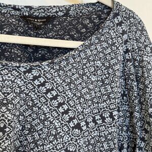 Lucky Brand 3X printed knit top in EUC featuring an allover navy and light gray mosaic print that looks like tiny floral tiles arranged in a bandana-style pattern, with a larger paisley-inspired border running along the hem and sleeves. The top has a relaxed, flowy silhouette with a scoop neckline and 3/4 length sleeves. Approximate measurements: 26 in. armpit to armpit; 27 in. length. Please ask all questions prior to purchase.