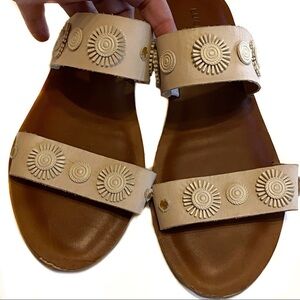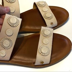 Lucky Brand Adalyn leather sandals 8M new flawed. Difficult to tell at dirt, but has some missing embellishments on sides of foot strap. Otherwise new with stickers intact. Please see photos. Could DIY these with something fun.
