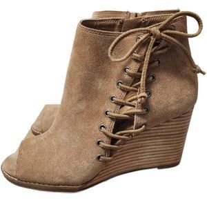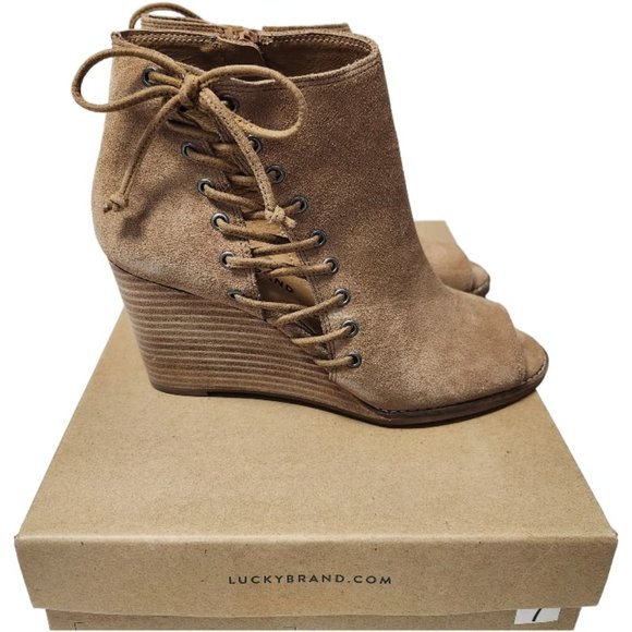 Lucky Brand Ankle Boots Jaevin Sesam Suede Open Peep Toe Wedge Booties Side Zip Womens Size 7