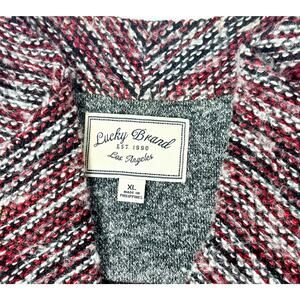 Stay warm and stylish in this Lucky Brand asymmetrical open-front sweater jacket, featuring a cozy blend of acrylic, wool, cotton, and polyester. This unique piece combines shades of red and grey in a textured knit with dramatic draping and an open waterfall front. With roomy front pockets and long sleeves, this jacket delivers both comfort and flair, perfect for layering on chilly days. Its oversized, relaxed silhouette makes it ideal for casual outings or cozy nights in.