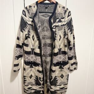 lucky brand cardigan, aztec knit sweater, open front cardigan, boho sweater coat, women’s plus 1x, cozy fall layering, tribal pattern knit, long cardigan, winter boho chic, neutral bohemian outerwear