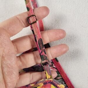 - Vibrant floral botanical print in pink, yellow, purple, black, and green