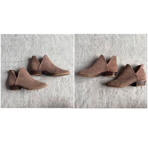 Good used condition. Baley Suede Bootie by Lucky Brand in Light Brown, a neutral tan shade. Minimalist western festival aesthetic, great to pair with denim or skirts. Ankle boot with deep side cut and low stacked heel. Perforated soft leather upper, see video. Note: light wear throughout, with streetwear, sticker residue and marker to bottom sole, fading to heel and outsoles, and moderate scuffs/discoloration at upper, see photos. Size 9, see photos for measurements.