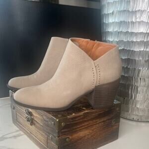 These NWOB Lucky Brand Ballita Heeled Booties feature v-notch details at the outer ankle, an almond toe, and stacked heels.