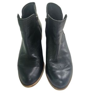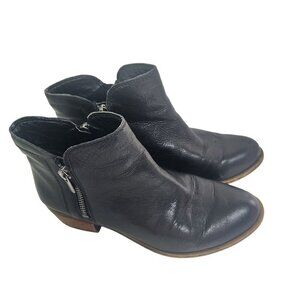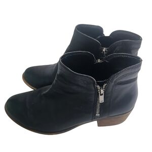Lucky Brand Basel Black Leather Booties, Size 7M. 1" Heel, Silver Zip Inside and Out, Almond Toe, Slight chip in leather as pictured. Good Pre-Owned Condition