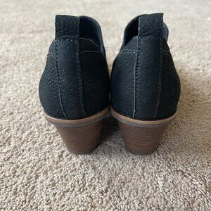 Sleek black ankle booties. Textured finish. Chunky heel for comfort.